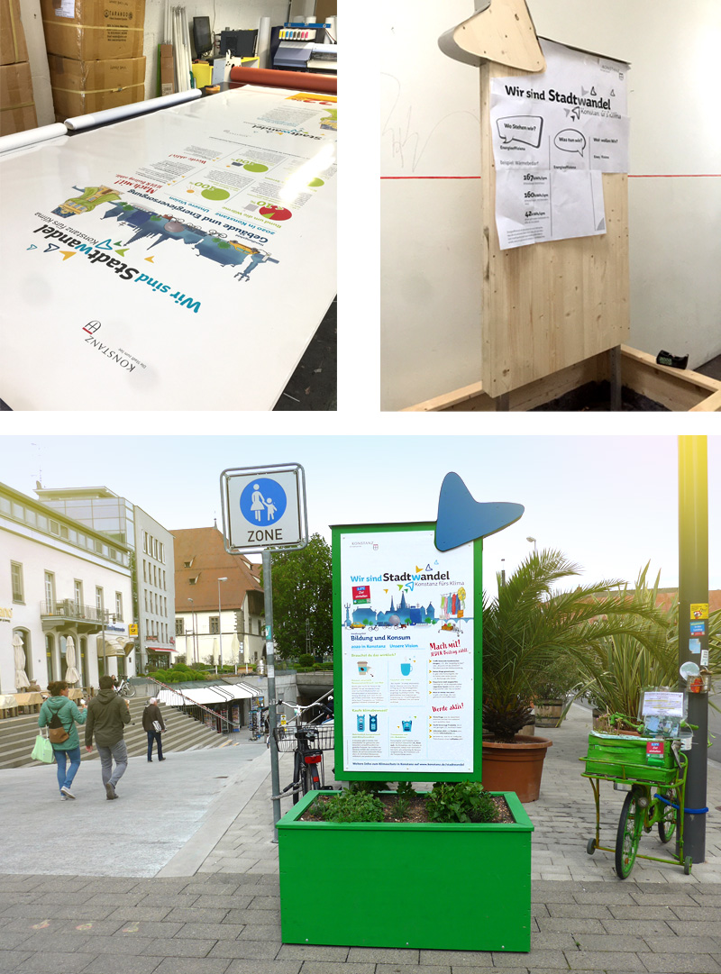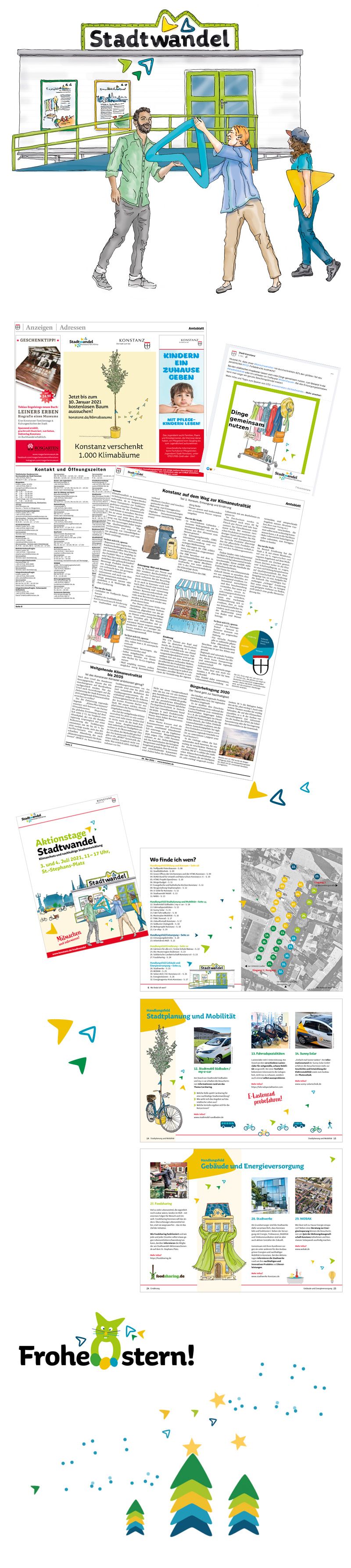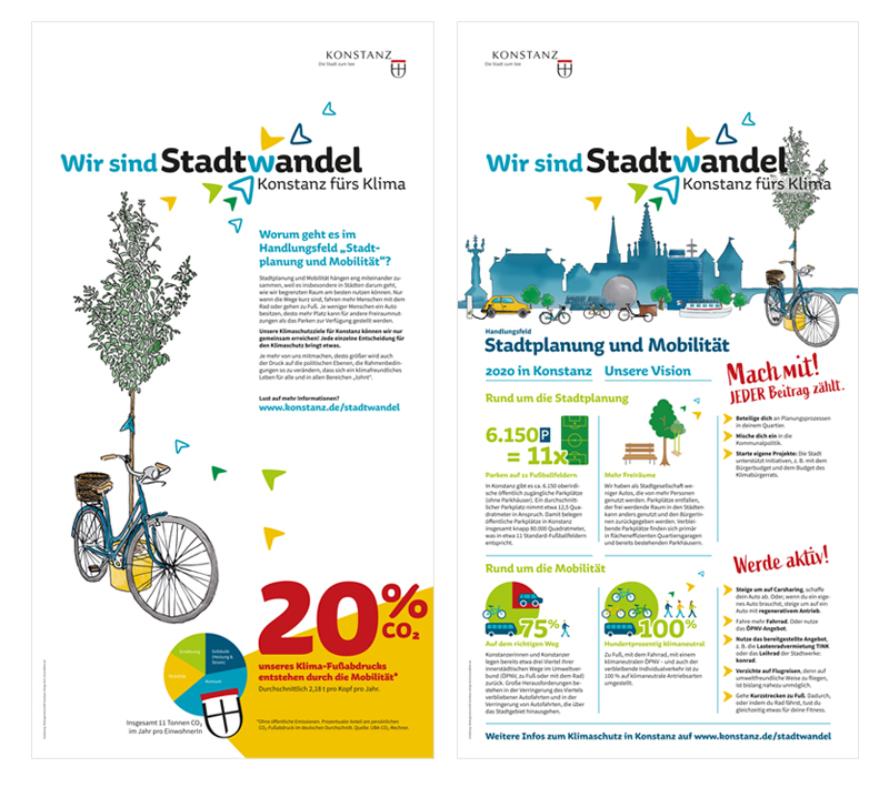 Gemeinsam mit homebase haben wir uns um den Auftrag "Designkonzept und Kommunikationskampagne zum Thema Klimaschutz" der Stadt Konstanz beworben. Städtische Maßnahmen in Sachen Klimaschutz kommunizieren, die Bürgerschaft einbinden bzw. Handlungsmöglichkeiten aufzeigen und zu einem klimabewussten Verhalten informieren, sensibilisieren und motivieren. Weg vom "Notstand" hin zu einem positiver geprägten Begriff. Es entstand der Begriff "Stadtwandel – Konstanz fürs Klima", das passende Identifikationselement, zahlreiche Handgezeichnete Illustrationen, ein wandelbares, fröhliches Corporate Design welches den unterschiedlichsten Anforderungen gerecht werden muss und wiedererkennbar bleibt. Ausserdem konzipierten wir das "Stadtwandelmobil", passende Torten-Tische und ... vieles mehr.